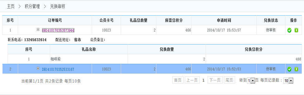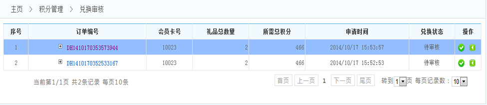 2.通過審核:點擊通過審核后,會員將得到禮品 將會扣減會員積分 此次的兌換完成(兌換成功)
