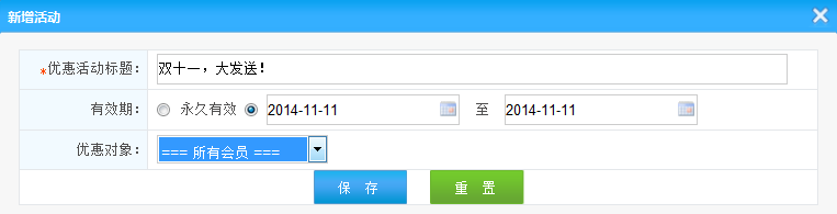 2.優(yōu)惠活動期限:設置這次活動的期限,可以長期有效,也可以一段時間有效