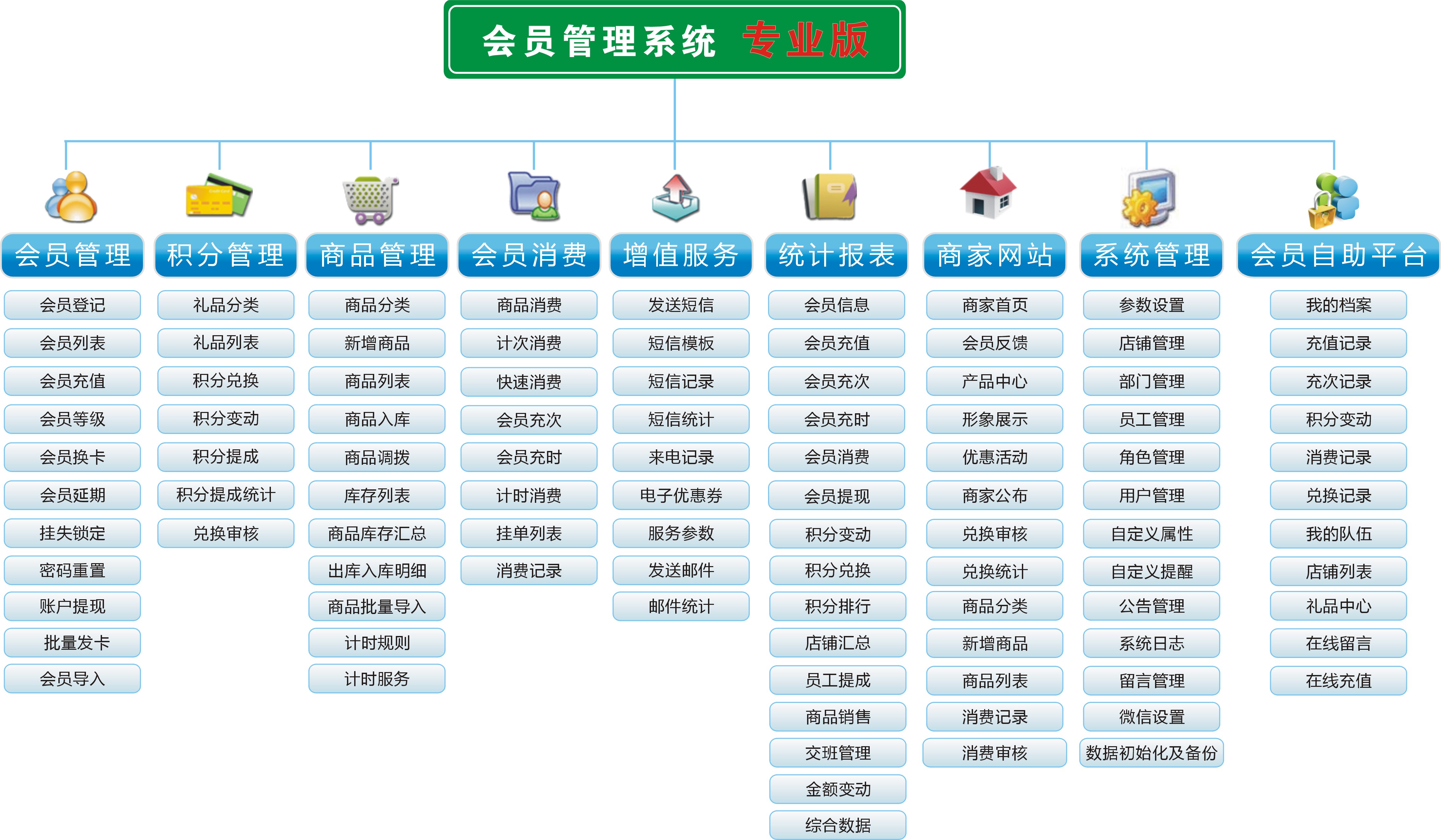 會員管理、積分管理、商品管理、會員消費、增值服務、統(tǒng)計報表、商家網(wǎng)站、系統(tǒng)管理等大模塊 可以對分店管理及各種消費數(shù)據(jù)分析!其適用于醫(yī)藥連鎖,美容美發(fā)連鎖店、超市連鎖店、服裝店連鎖店、母嬰店連鎖店、健身房連鎖店、