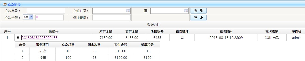 充次記錄: 1.查詢:可以根據(jù)充值單號 時間段等條件查詢 2.導(dǎo)出:可以將按條件查詢出來的數(shù)據(jù),以Excel表格形式導(dǎo)出 3.列表:雙擊充次單號,可以展示出充次詳情